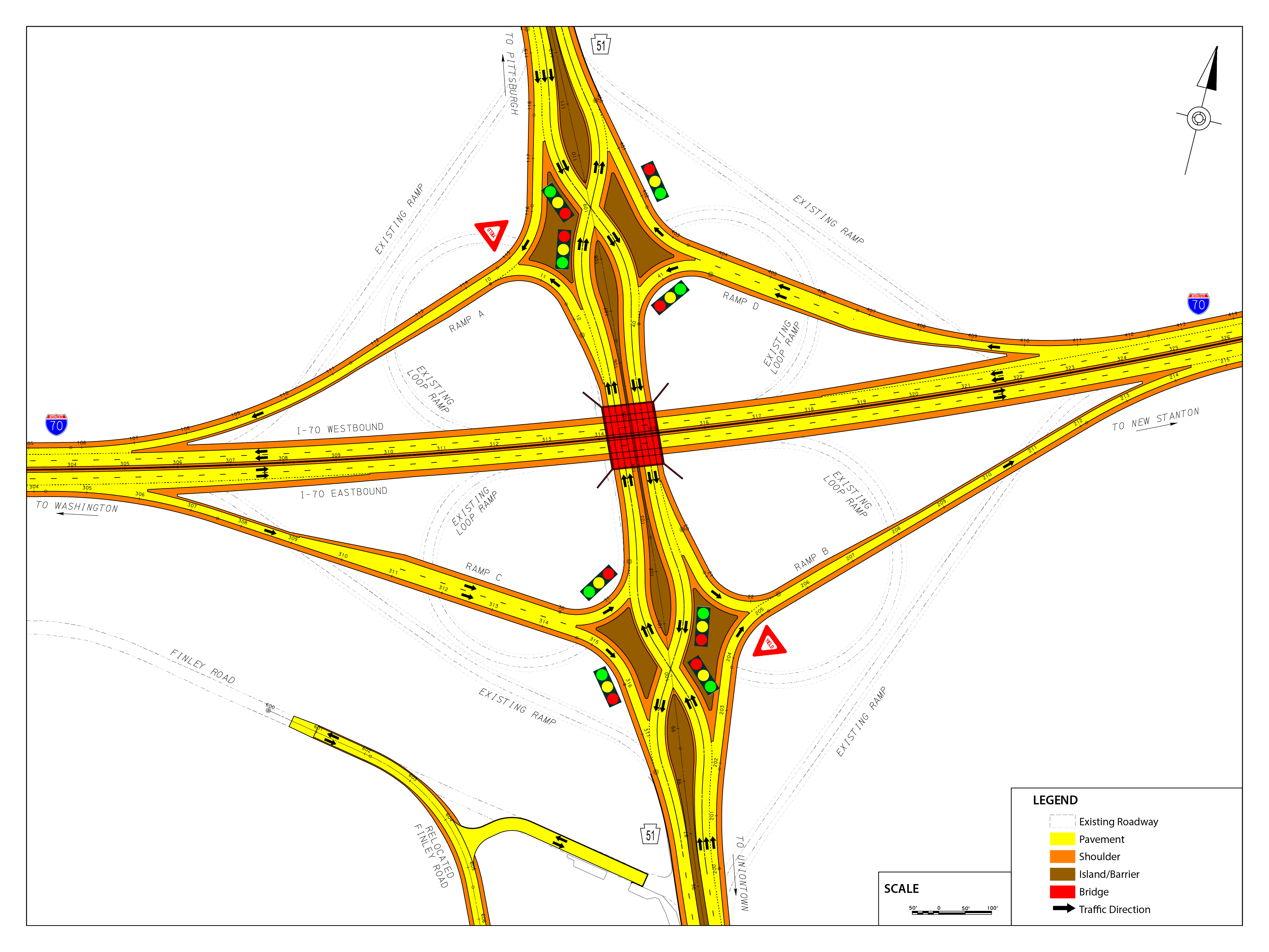 This project includes improvements to I-70 and Route 51. I-70 will be reconstructed to make this section of I-70 similar to other reconstructed sections of I-70 to the east and west. A Diverging Diamond Interchange (DDI) will be constructed to replace the current substandard cloverleaf interchange at I-70/Route51.
